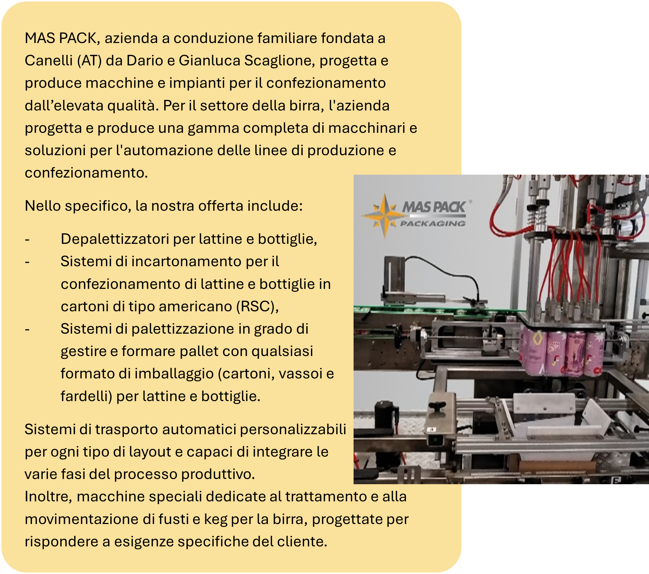 Ingegner Scaglione, Mas Pack si occupa di imballaggio per bottiglie e lattine. Potrebbe chiarire il vostro focus principale nel settore birrario? Realizziamo depallettizzatori che inseriscono bottiglie o lattine nelle linee di riempimento, e macchine per l’imballaggio secondario. Non ci occupiamo del riempimento vero e proprio, ma collaboriamo con partner per fornire linee complete. Copriamo un ampio range di velocità, da 2.000 a 30.000 bottiglie o lattine l’ora, adattandoci a diverse esigenze produttive. Studiamo il layout, la logica e i trasportatori per massimizzare l’efficienza. Gestiamo linee in grado di lavorare fino a 40 formati diversi di bottiglie o lattine, e cartoni variabili per dimensioni e quantità. Il cambio formato è rapido e automatico: dall’interfaccia operatore basta un tocco, o è sufficiente inserire parametri come altezza e diametro per settare la macchina, riducendo i tempi morti. Come si integrano le vostre macchine in linee esistenti, e qual è il ruolo dell’automazione? Tutte le macchine sono pilotate da PLC con pannello operatore, e si interfacciano facilmente con altri macchinari tramite scambio di segnali. Gestiamo noi la comunicazione per ottimizzare l’intera linea. Memorizziamo dati su produttività, efficienza e consumi energetici, trasmettendoli al database aziendale. Questo permette ai responsabili di produzione di analizzare performance, identificare inefficienze e decidere produzioni ottimali.