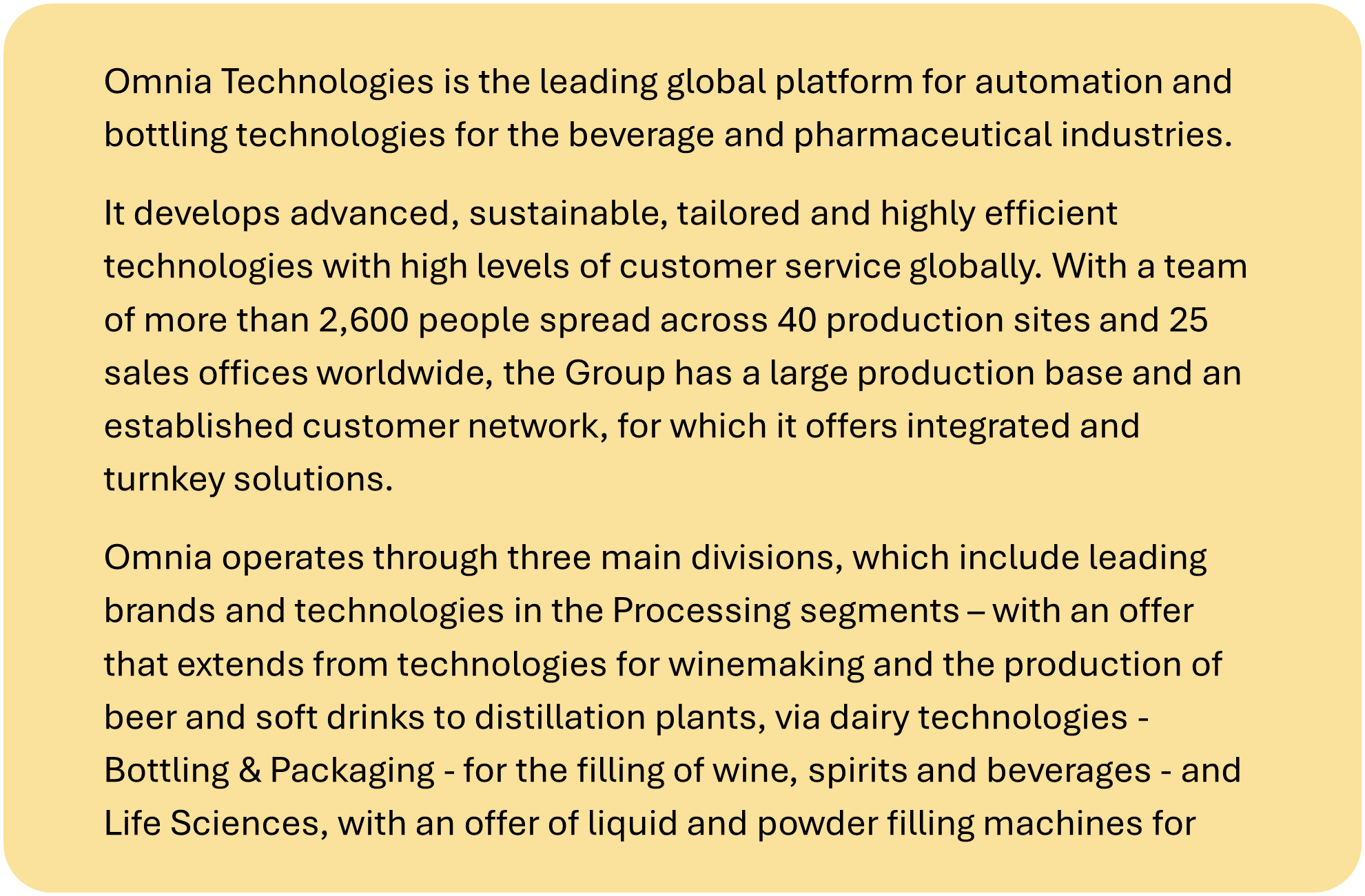 Mr Giacobini, Omnia Technologies is quite a large group. Can you illustrate how it is positioned in the beer sector? Omnia Technologies is a project launched at the end of 2020 that brings together leading companies in the beverage and pharmaceutical sectors to create a global service and technical-commercial support platform. Our strength is being the single point of contact for the customer, covering the entire production cycle, from the raw material to the packaged product. Our uniqueness lies in the holistic approach. We do not sell single machines, but tailor-made solutions that are created by listening to the customer. We have master brewers in the company, so we speak the brewers' language, not the language of the tank builders or software developers. This allows us to translate the brewers' requirements into systems that respond exactly to their needs. As regards bottling and packaging, how do you respond to the needs for versatility, for example for cans, which are increasingly in demand? Versatility is crucial, especially for craft brewers who want to switch from bottles to cans without changing the line. We design monoblocs that can handle multiple formats, even kegs, with quick and intuitive format changes. In terms of packaging, we have presented innovative solutions, such as a palletising system that uses recycled paper instead of plastic film, thereby reducing the environmental impact.